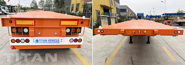 Flatbed tractor trailer - it is a type of semi-trailer for transporting sea containers on highways. Includes a semi-trailer chassis and a fitting platform for container installation. The 3 axle flatbed tractor trailer is designed to transport two 20-foot or one 40 foot containers. TITAN also equipped 8 set locks on the platform, which the function is used to fixed the containers tightly on the flatbed trailer.